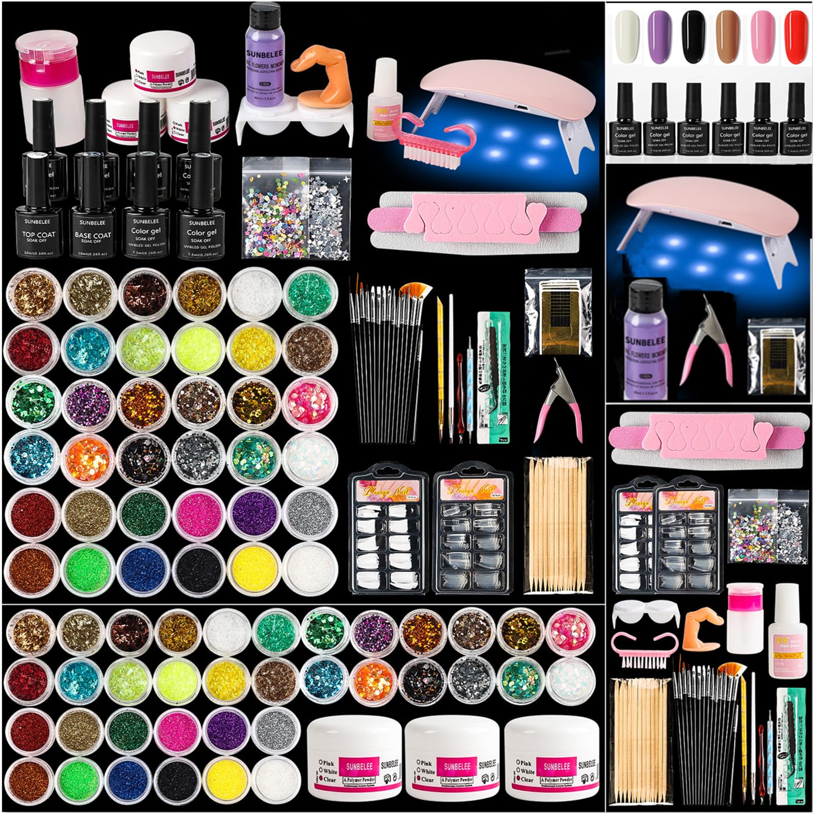 - Nail Kit for Beginners with Everything: Acrylic nail kit set professional is most perfect acrylic nail kit. Contains all the necessary acrylic nail supplies, included 3 colors acrylic powder, gel nail polish, top coat and base coat, uv/led nail lamp, 36 colors sequins, glitter sets, nail clipper and some DIY acrylic nail set, a perfect for all beginners.