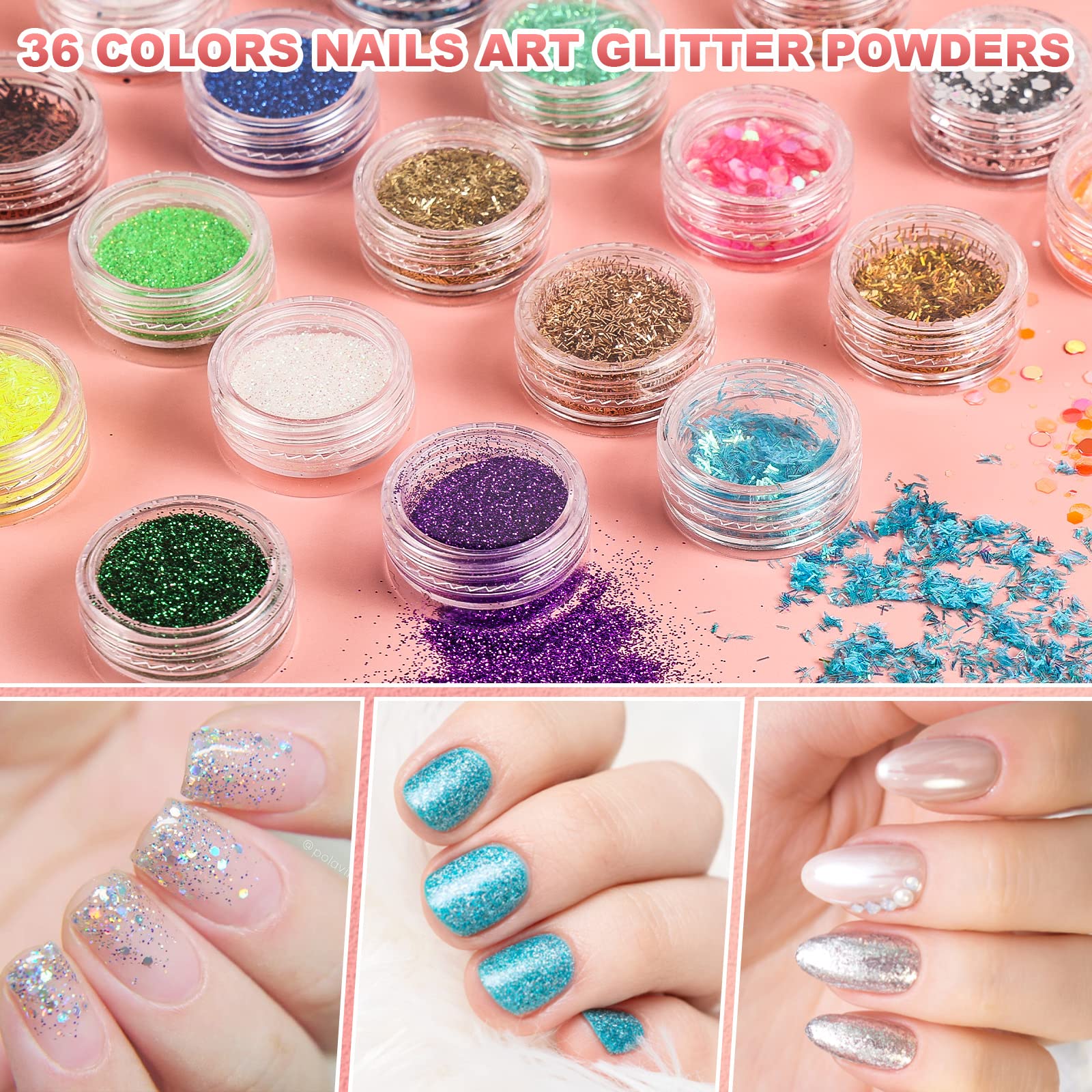- 36 Colors Glitter Kit: Professional acrylic nail kit contains 36 different colors glitter, shiny and colorful. Mix acrylic powder and Glitters to get a new color and style Suitable for all seasons creating beautiful nail for long lasting sparkle nail tips.