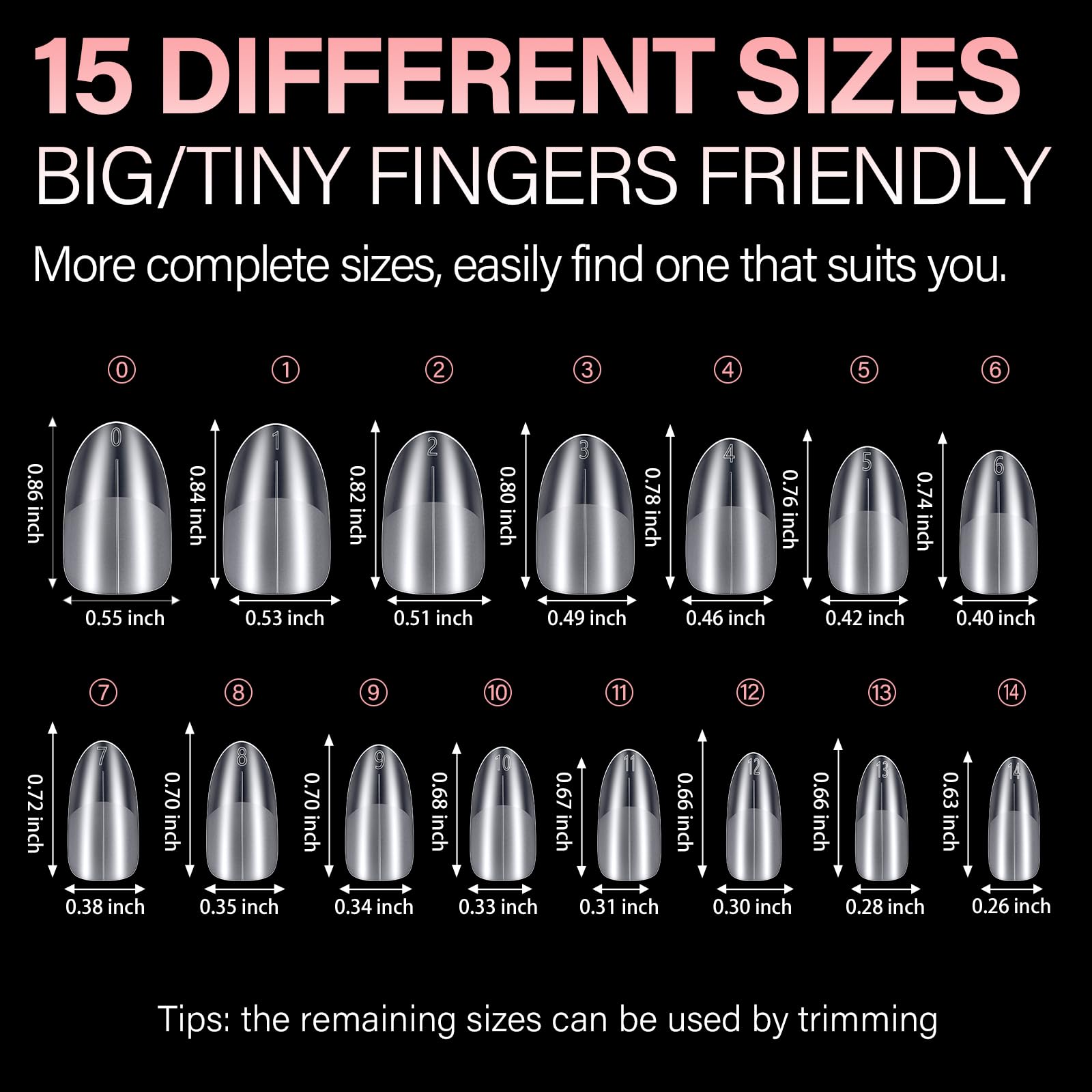 - 15 Size Options: Our almond shape nail tips have 15 different sizes with each size 16pcs, totally 240pcs. And there are numbers “0-14” marked on the fingertips, help quickly find your sizes. Don’t worry to cause size wasting; you can make good use of the remaining sizes by trimming