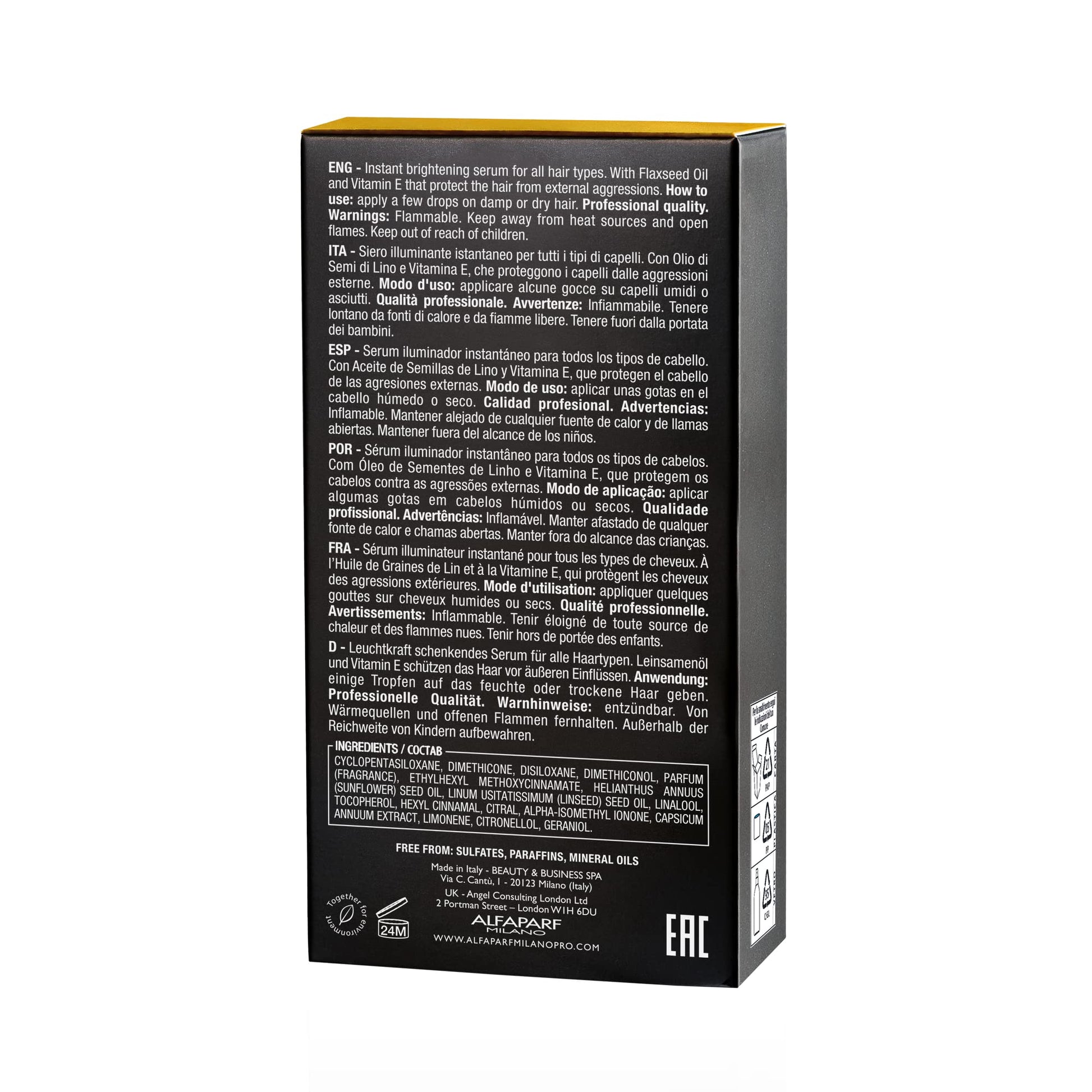 Details: Cristalli Liquidi is an Italian professional hair oil serum for all hair types that instantly brightens and protects your hair. It is a luxurious finishing product and the final touch for radiant hair. The new formula is now vegan and free from ingredients of animal origin and derivation. It also now includes thermal protection from the heat of hot tools up to 466 degrees F. Active ingredients include Flaxseed Oil, that gives hair instant gloss and shine and Vitamin E, which includes antioxidant properties. The lightweight hair serum is easy-to-apply and envelops the hair with light and flow. The hair product is kind to your hair and color. It has a citrus, floral, green, musky fragrance. Cristalli Liquidi is a universal beauty fluid and the international symbol of Alfaparf Milano. For over 30 years, the original Semi di Lino formula has been our most used product by our hairstylists and consumers. A shine boosting secret for every style, Cristalli Liquidi provides radiant hair and enhances authentic beauty. The revitalizing serum is an instant hair make-over. The hair treatment protects against humidity and harsh external agents that leave the hair dull and brittle. Your hair will shine with new life, become tangle-free and irresistible to the touch. Bid farewell to dull hair and knots. Apply it to hair for unparalleled shine and before brushing for detangling action. Before blow drying, apply to the lengths or just the ends to facilitate drying and obtain a completely new result. Apply Cristalli Liquidi to the lengths and ends at any time of day to fight humidity and prolong your blow-dry. Semi Di Lino is Italian for flaxseed. Due to its remarkable properties, flaxseed has been used since the time of the ancient Egyptians to maintain beautiful skin and hair. Alfaparf Milano has now perfected flaxseed extract to enhance and prolong shine, protect color, and treat and nourish hair.