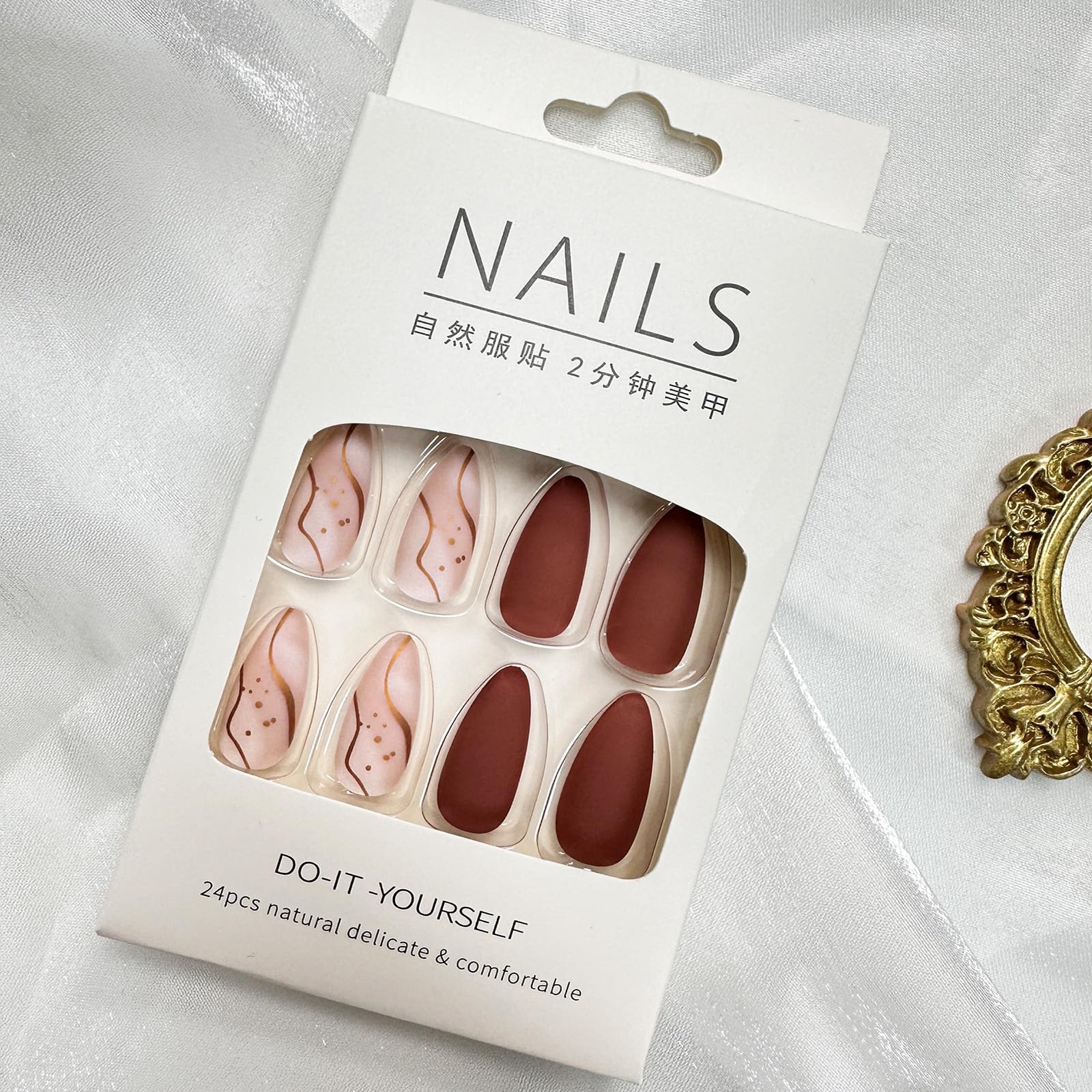 Almond Press on Nails Medium Fake Nails with Designs Brown False Nails Press ons Gold Line Acrylic Glue on Nails Matte Full Cover Cute Artificial Stick on Nails for Women Nails Decorations 24Pcs