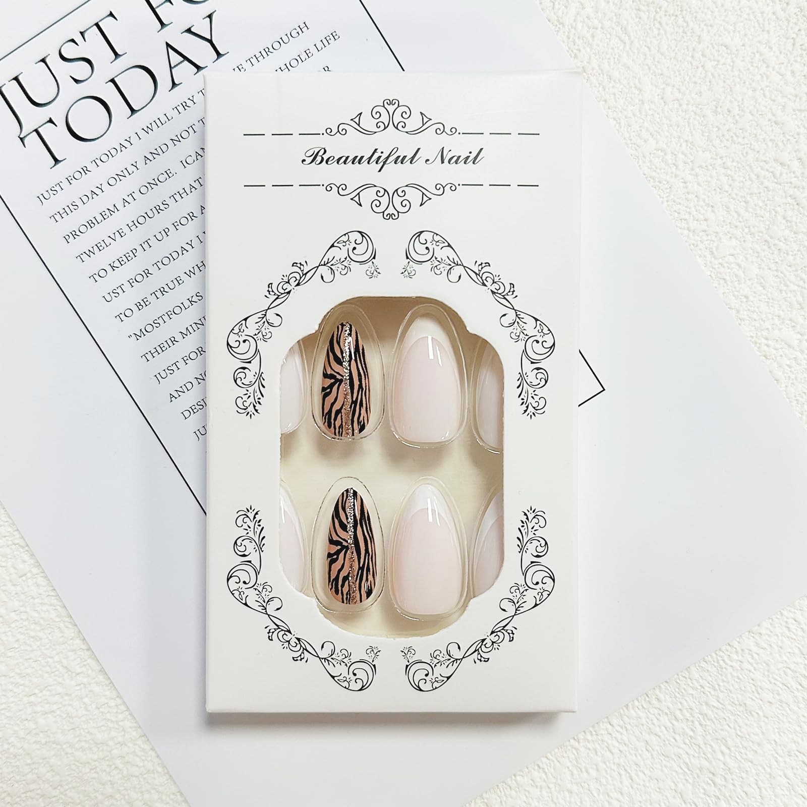 Almond Press on Nails Medium Fake Nails with Designs White French Tip False Nails Press ons Glitter Line Zebra Print Glossy Acrylic Glue on Nails Full Cover Artificial Stick on for Women Supplies
