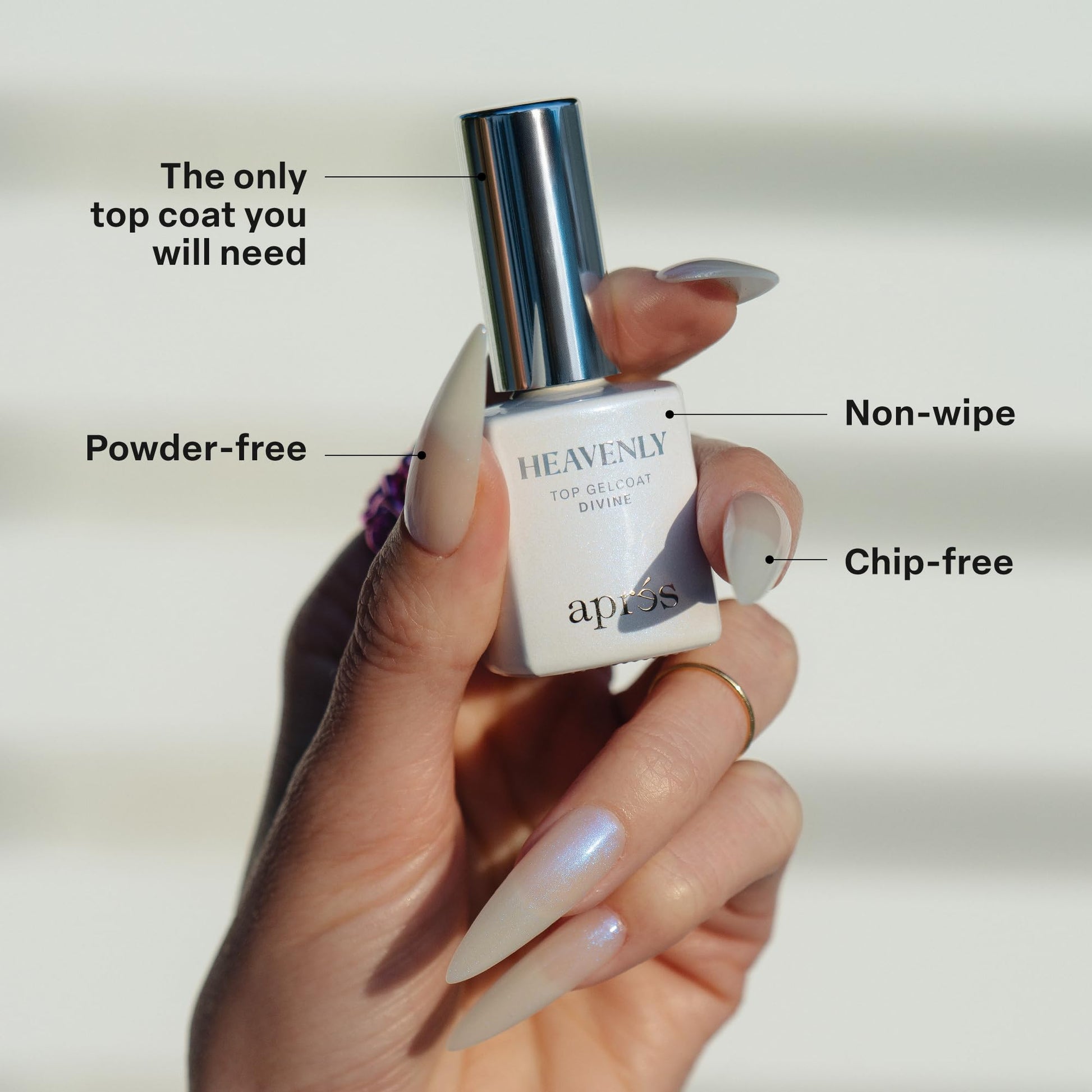 - Shimmery, Celestial Finish: Elevate your nails with the Apres Heavenly Top Gelcoat, featuring refined shimmer particles that create a sparkling, otherworldly effect. Perfect for adding a touch of glamour to any manicure.