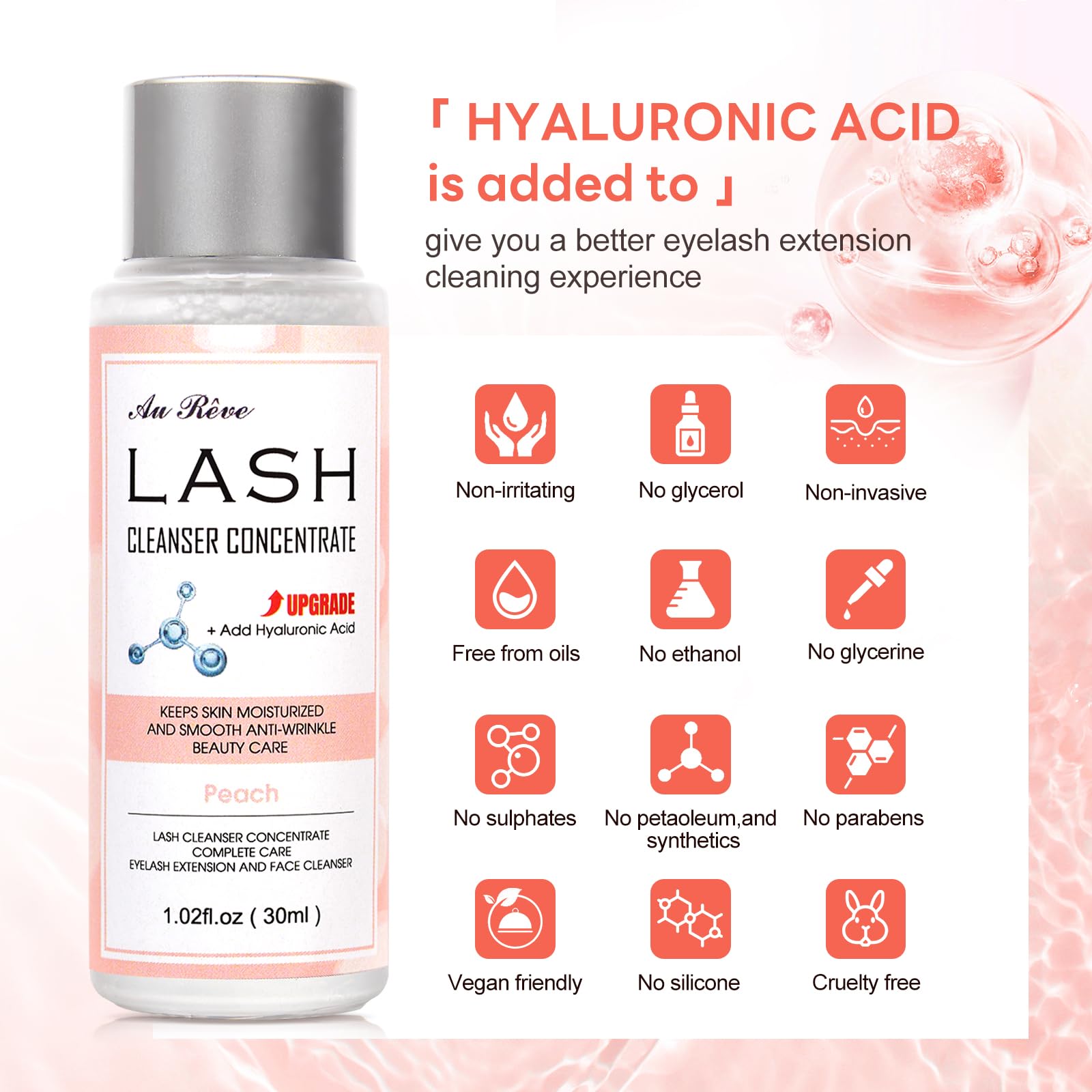AuReve Lash Shampoo Concentrate 30ml Lash Cleanser Concentrate Add Hyaluronic Acid Oil-Free Lash Extension Shampoo Perfect for Salon,Peach