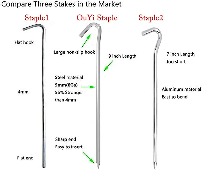 - TENT STAKES & TENT PEGS - Galvanized steel spikes with hook, used as tent stakes, tent pegs,camping stakes, tarp hooks, inflatables stake,stakes Decorations stakes, outdoor decorations stakes, ground stakes, gazebo anchors, garden staples, yard camping stakes, metal tarp stakes, tents stakes, yard stakes, ,tent spikes, tent hooks. Packs of 25 see ASIN B07JJSXGV1,Packs of 50 see ASIN B07JJ6146T.