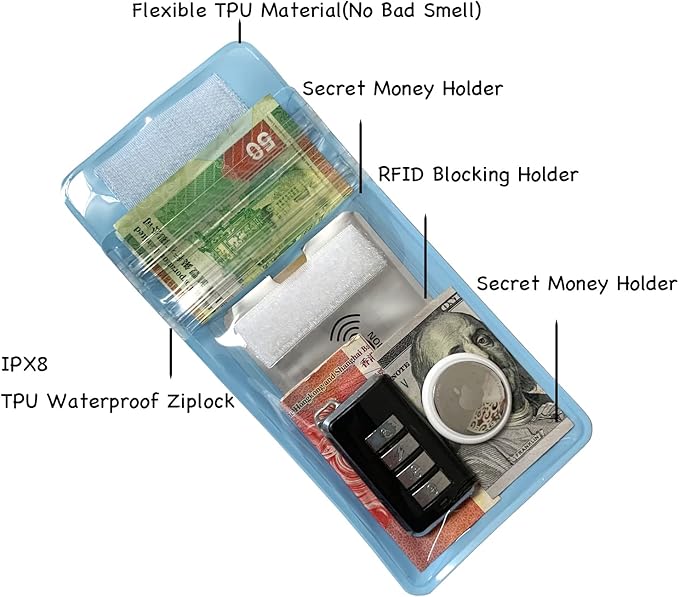 - 1. IPX8 Waterproof armband Key holder/Wallet waterproof up to 32 feet(10m),No worries of your valuables getting Wet, protect your GPS,car key Fob, Money, Vaccine Card, ID, credit card and valuables safe and dry from water, splash, or total immersion whether you are swimming, surfing, diving, kayaking, river rafting, snorkeling, tubing, paddle boarding, ,water slides, water slides, fishing, hunting, camping, running, biking, adventure travel or other watersports or outdoor activities.