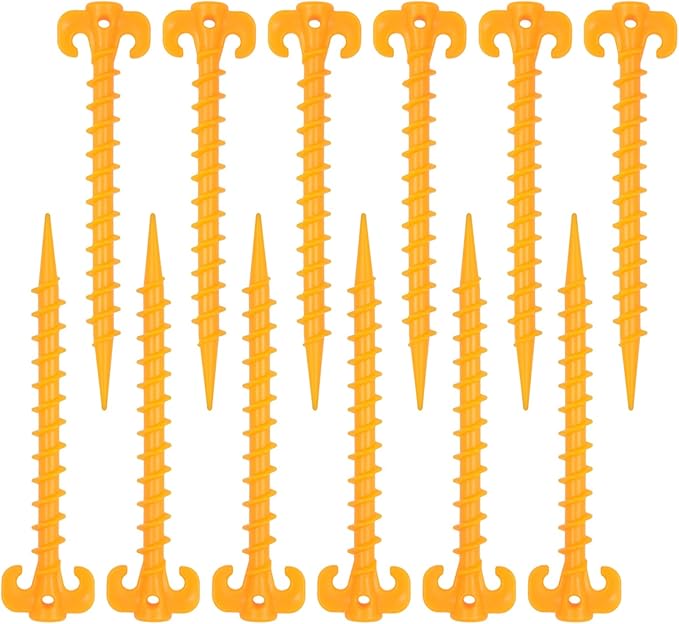 - SPIRAL CONSPICUOUS DESIGN: Spiraled tent spike design firmly anchors your spikes into the ground, reducing the risk from wind and heavy rain to keep your tent securely in place. The bright orange design allows you to easily see canopy stakes on the ground or sand and can prevent tripping.