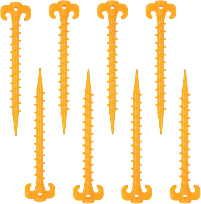 - SPIRAL CONSPICUOUS DESIGN: Spiraled tent spike design firmly anchors your spikes into the ground, reducing the risk from wind and heavy rain to keep your tent securely in place. The bright orange design allows you to easily see canopy stakes on the ground or sand and can prevent tripping.