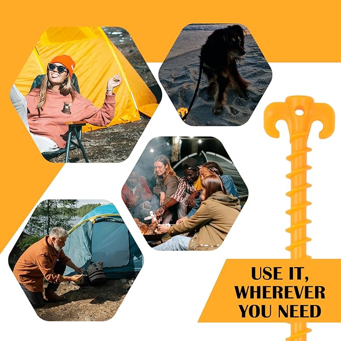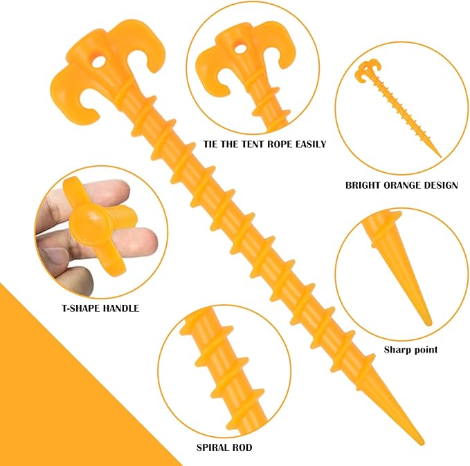 - SPIRAL CONSPICUOUS DESIGN: Spiraled tent spike design firmly anchors your spikes into the ground, reducing the risk from wind and heavy rain to keep your tent securely in place. The bright orange design allows you to easily see canopy stakes on the ground or sand and can prevent tripping.