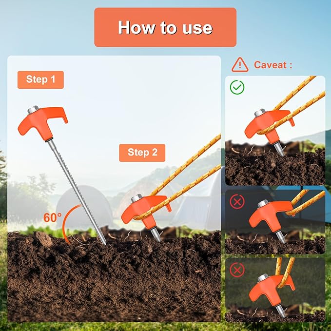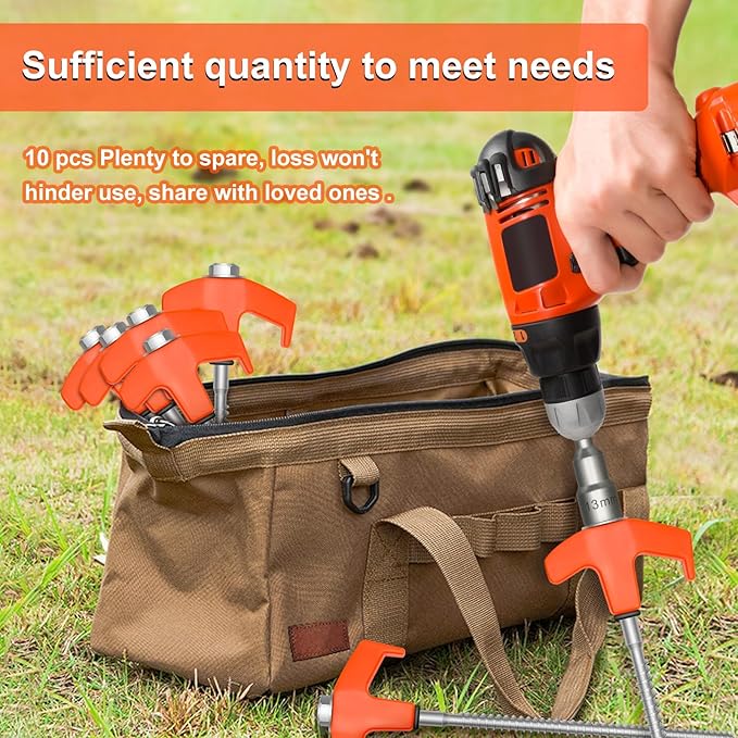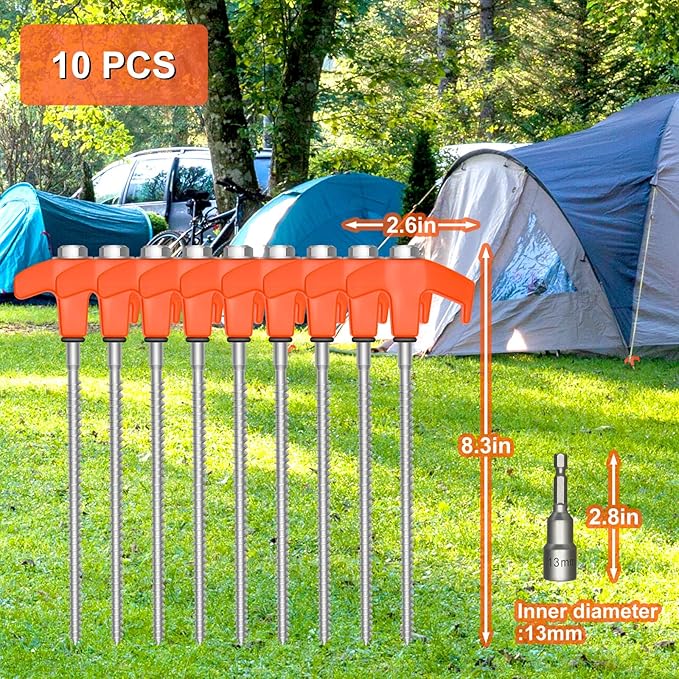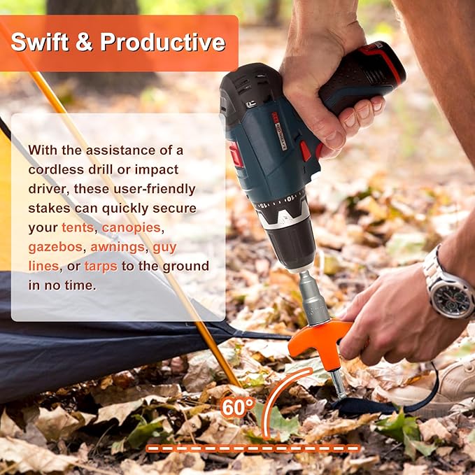 - Effortless Installation: With a smooth metal thread and a convenient design, our tent stakes can be quickly and effortlessly fixed into the ground using a cordless drill or impact driver. This hassle-free installation process saves you time and energy, allowing you to focus on enjoying your camping trip.