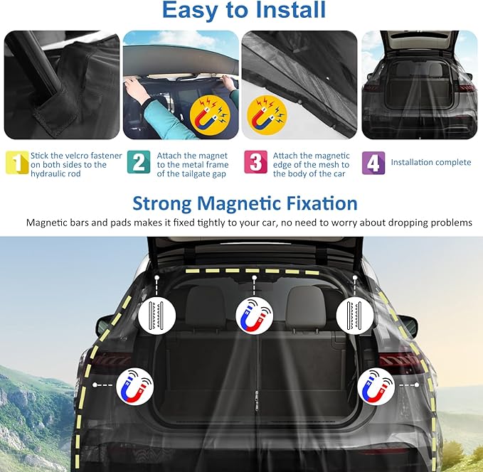 - 【Easy to install & Convenient Storage】- The magnetic design of tailgate net ensures quick and easy installation on the tailgate frame, allowing you to set up the mesh net in just minutes. Simply attach it to your vehicle frame and no need to worry about dropping it.Also, this car tailgate mesh screen is lightweight and comes with a carrying bag, after use, just fold it up and put it in the storage bag to finish storing.