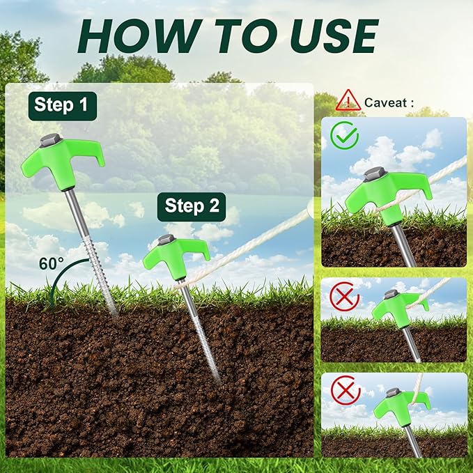 - EASY INSTALLATION :Our tent pegs are designed with smooth metal threads and come with a magnetic tent peg adapter, which can be quickly and easily fixed on the ground using a cordless drill or impact driver, and can be set up simply and easily in a wide range of terrains