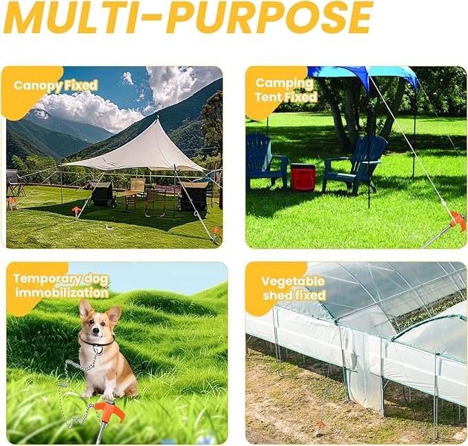 - Wide range of uses : Our tent pegs are widely used, not only in the sand and gravel, dirt, beach, snow and other places, but also can be fixed home garden plants, fixed canopy, temporary fixed dog, fixed holiday decorations, and we have a variety of colors, can be used with each other and decorations, and is not flashy, in the case of having a beautiful appearance, there is also a very strong grip, making it Completely capable of doing any job