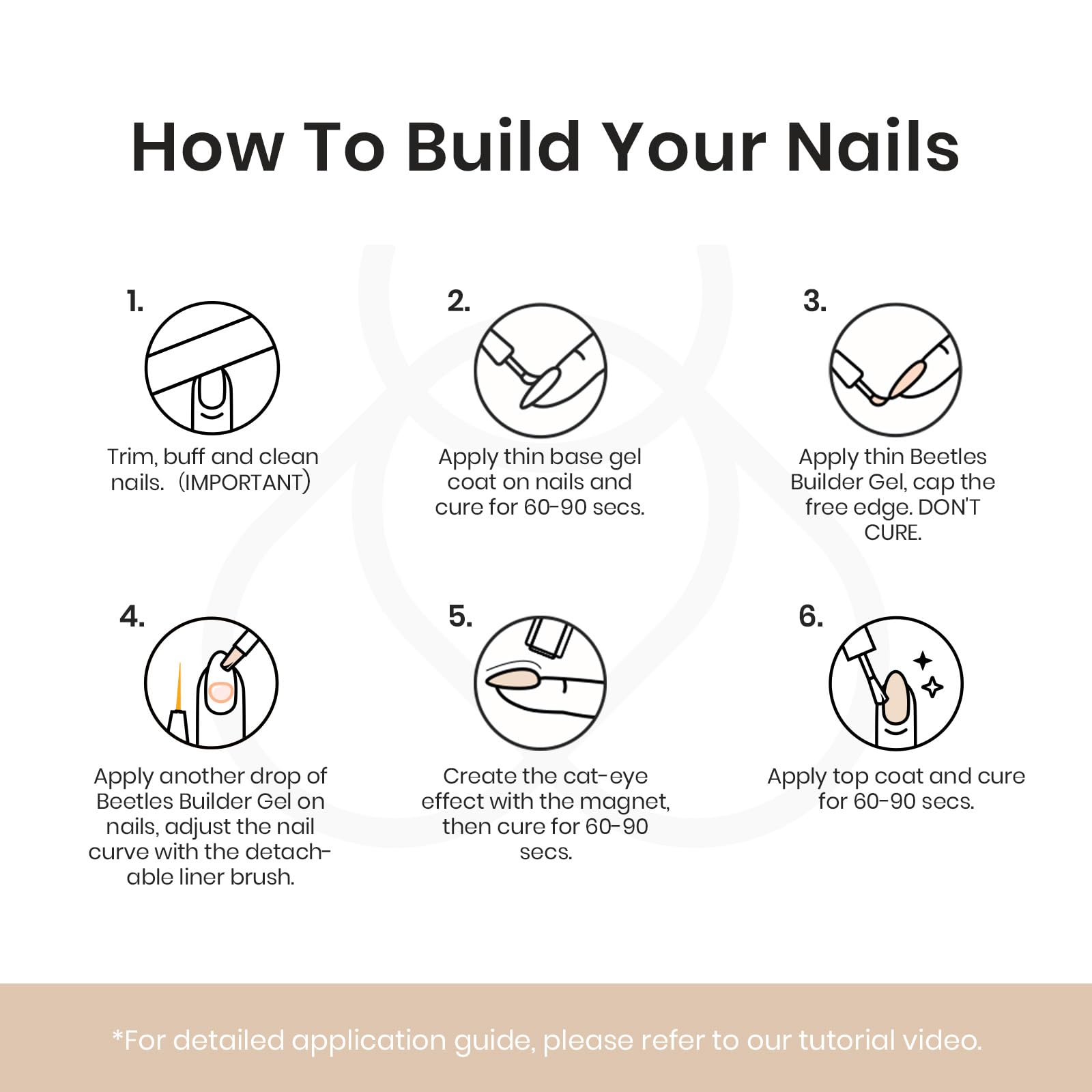 - 【Beetles Builder Gel for Nails】Beetle launches the latest cat eye builder gel for nail strengthener set! Our builder gel set include 4*gel builder, 1*magnet and 1*liner nail brush. Equipped with magnet to attract different cat eye shapes. And the liner nail brush can be used to adjust the overall curvature of the nail surface, prevent glue accumulation, and create perfect nail radian and Apex. (Notice: Need to be used with base gel, make your builder works more solid.)