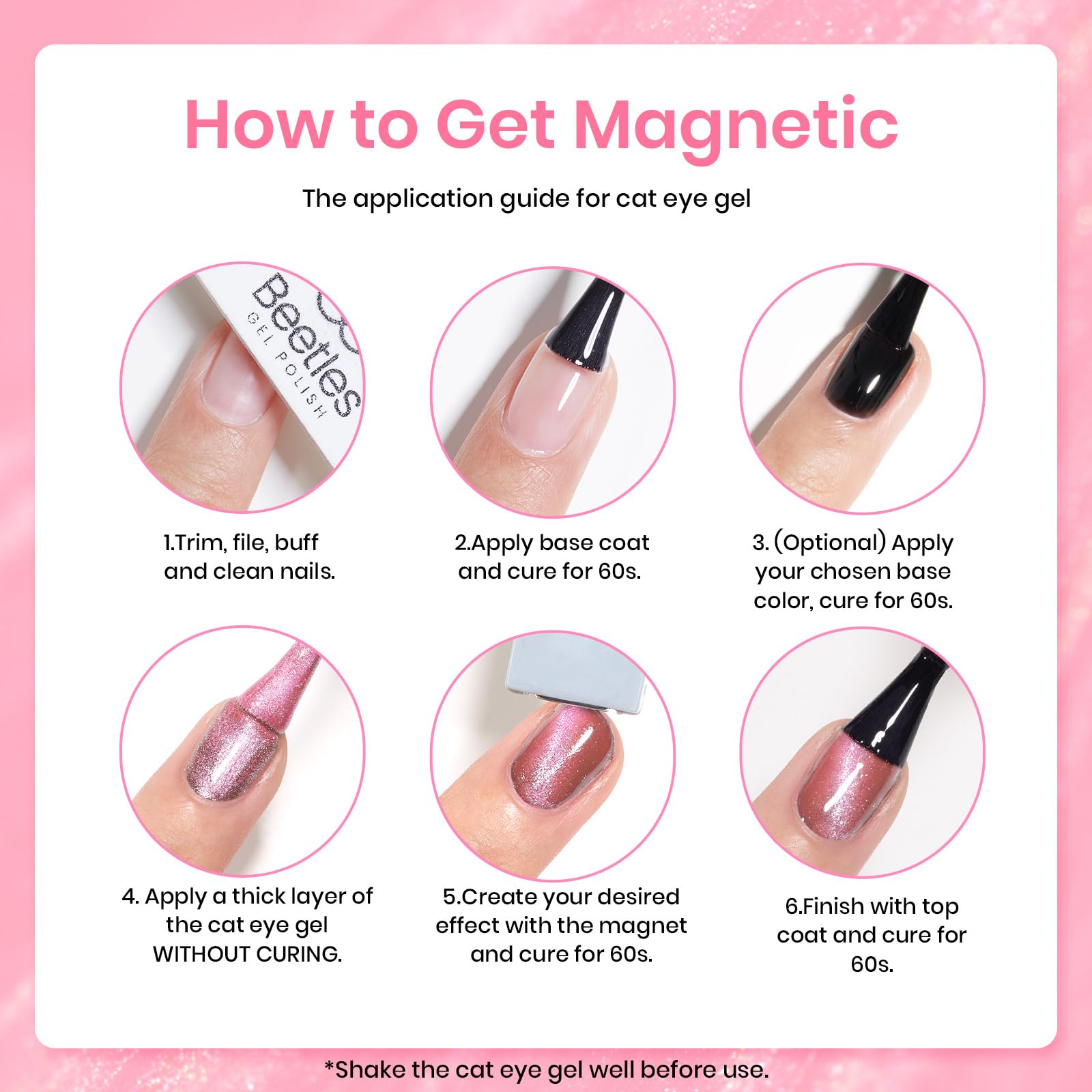 - 【Warm Tips】Please conduct a skin test before use with glitter pink cat eye gel nail polish. Professionally formulated and only used for nails. Place the magnetic stick over the surface about 3-5mm for 5-10 secs to get your desired effect! After repeatedly sucking the cat eye color gel without any effect, the magnetic powder will become ineffective. You can add a layer to suck the cat eye gel again