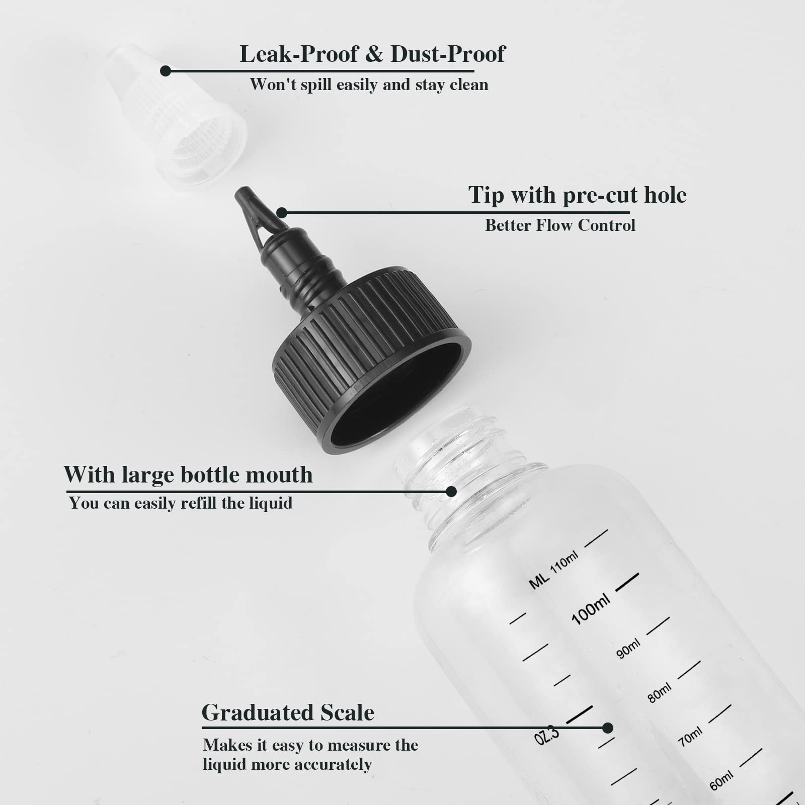 - 【Graduated Scale for Easy Observation】Our applicator bottle for hair makes it easy to measure the liquid more accurately and measure the liquid ratios for more dispensing. Two kinds of scales(oz/ml) are on the transparent bottle body, clear and easy to observe.