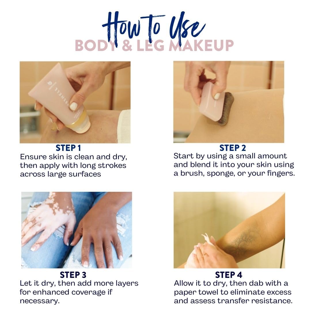 - Gentle Ingredients, Full Coverage Leg Concealer Waterproof: Gorgeous legs & even coloring should never come at the expense of your skin; That’s why our leg makeup waterproof no transfer is a clean and fragrance free body cover up makeup infused with ingredients like Vitamin E and essential fatty acids to hydrate, soothe & nourish your skin