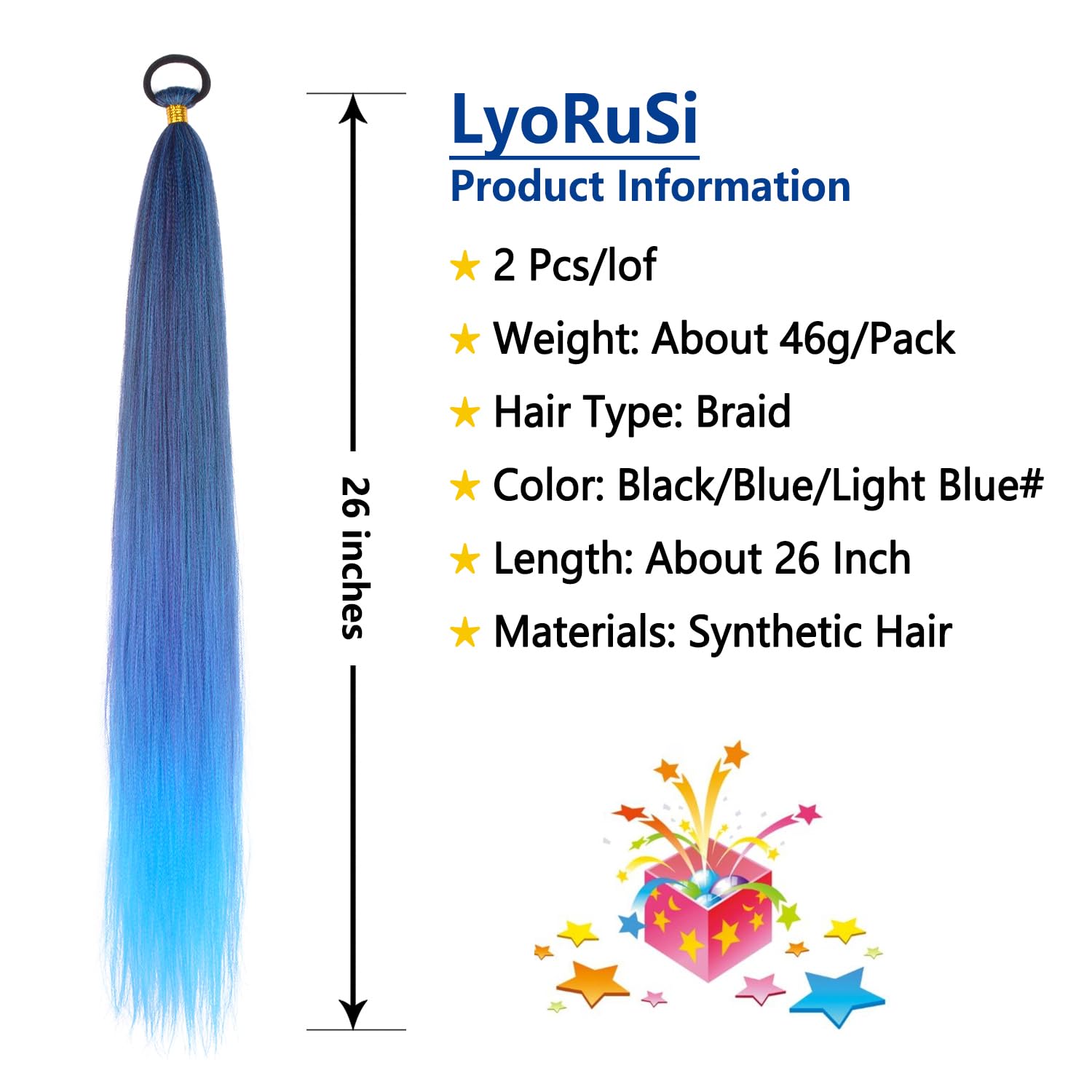 Braid Ponytail Extension with Elastic Tie Straight Sleek Wrap Around Braid Hair Extensions Ponytail Natural Soft Synthetic Hairpiece Blue gradient 26 Inch(Black/Blue/Light Blue#)
