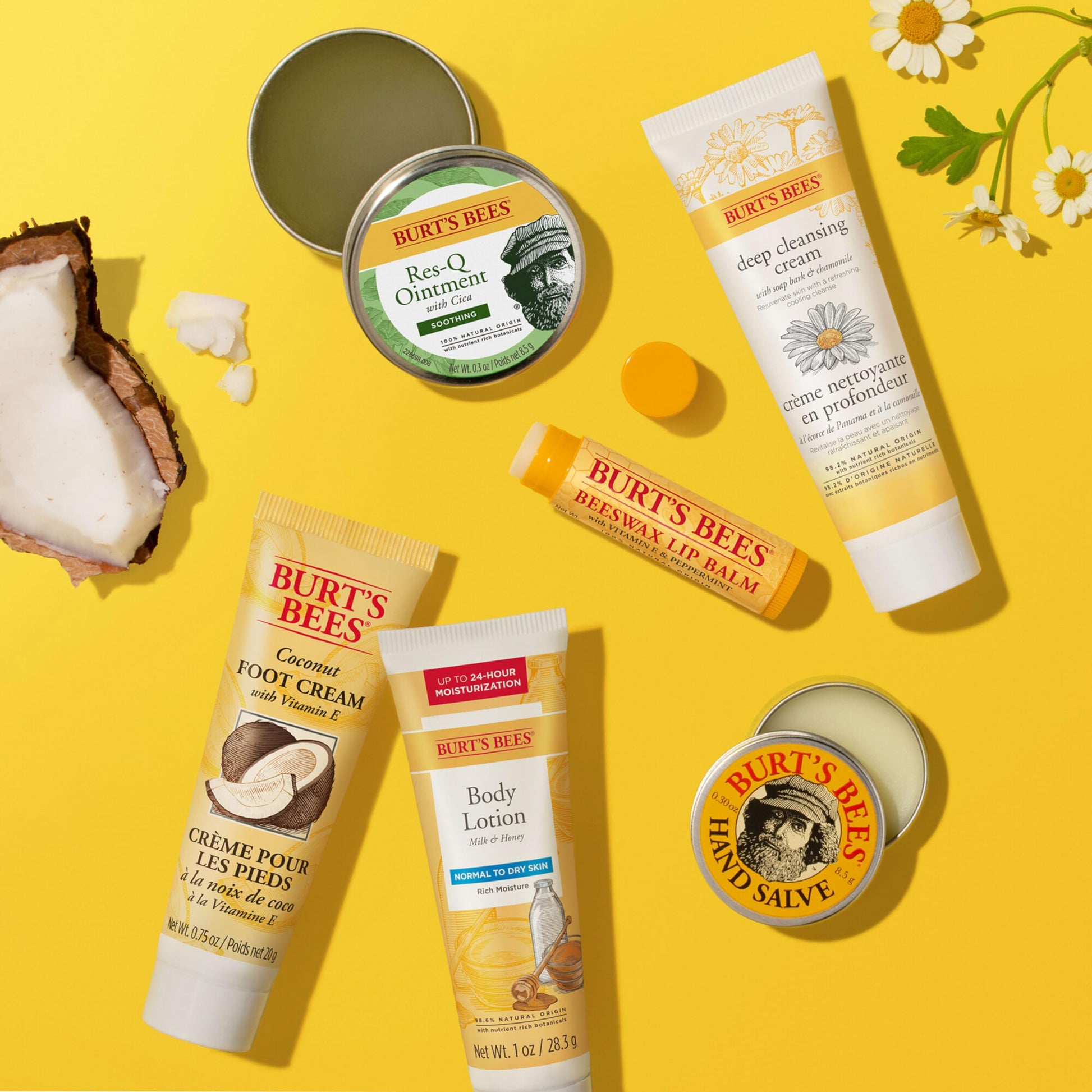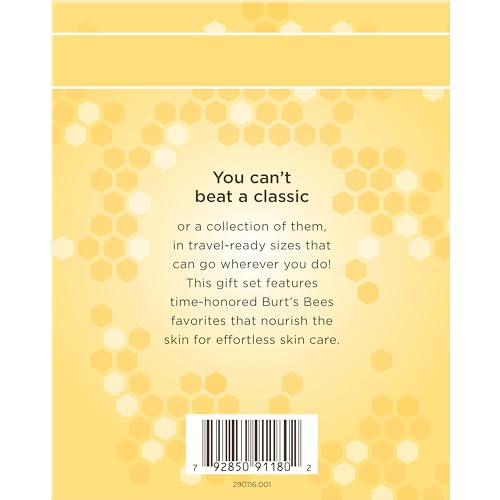 Details: You cant beat a classic or a collection of them, in travel-ready sizes that can go wherever you do! This gift set features time-honored Burts Bees favorites that nourish the skin for effortless skin care. Bring the spa to your home with Coconut Foot Cream that pampers and soothes dry, neglected feet with a rich, naturally moisturizing formula. Milk & Honey Body Lotion has a non-greasy formula and features 98.6% natural origin ingredients like milk, honey, vitamin E, coconut and grapeseed oil. Soap Bark & Chamomile Deep Cleansing Cream is a 99% natural origin face wash that is non-irritating and gentle enough for daily use. Formulated with comfrey allantoin to comfort skin, multipurpose Res-Q Ointment is loaded with a blend of comforting herbal ingredients to nurture skin. Our classic hand salve contains a soothing blend of botanical oils and conditioning beeswax to shield rough, hard-working skin. Original beeswax lip balm hydrates and nourish dry lips with Vitamin E and a hint of peppermint oil. These trial sizes are a great way to sample our products for the first time, or to keep on the go.