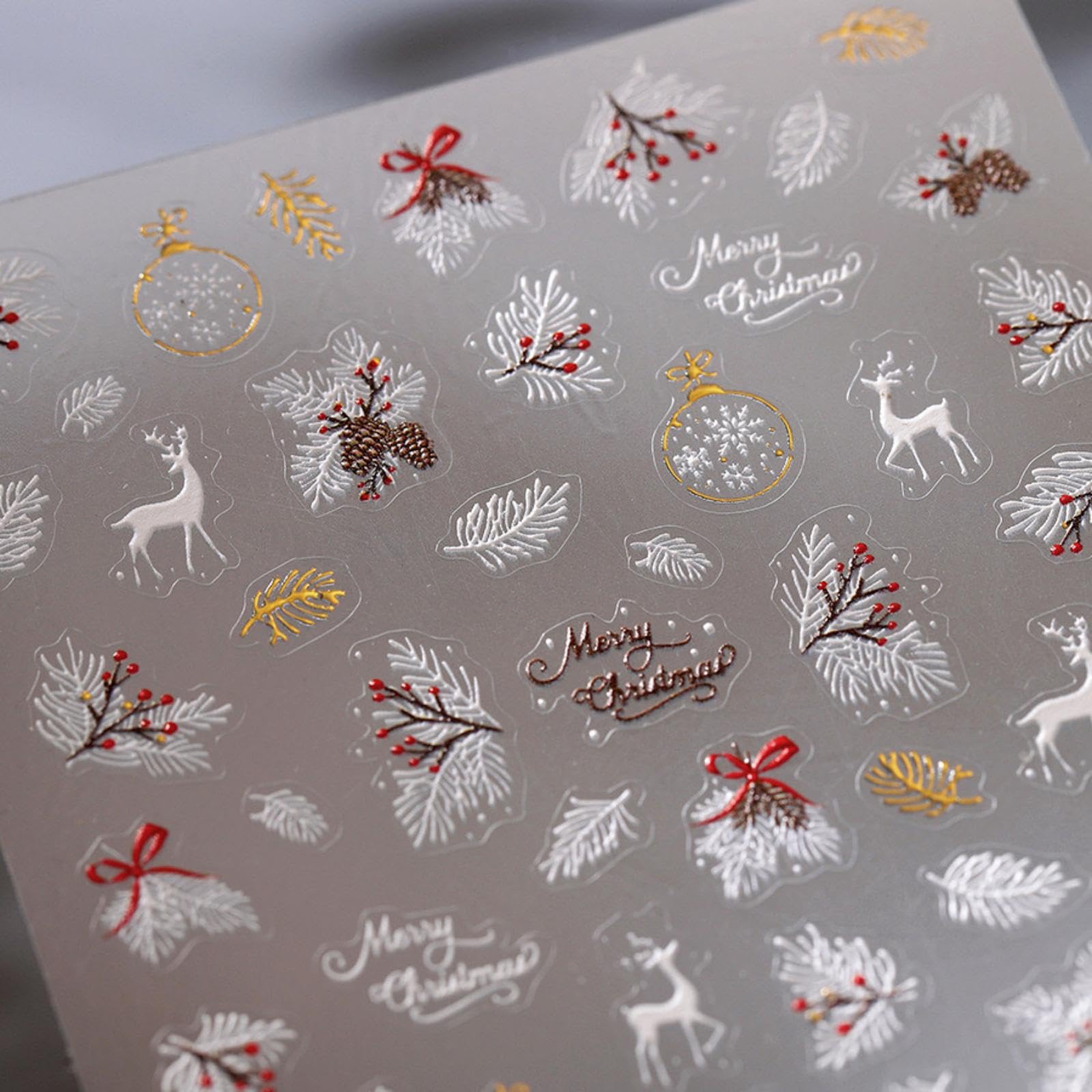 - Christmas Nail Decals: 1 sheet of 5D embossing carving patterns litter Christmas nail stickers give people an intuitive and advanced exquisite feeling. Snowflake Elk Feather elements winter design nail decals are perfect for decorations for your fall winter nails