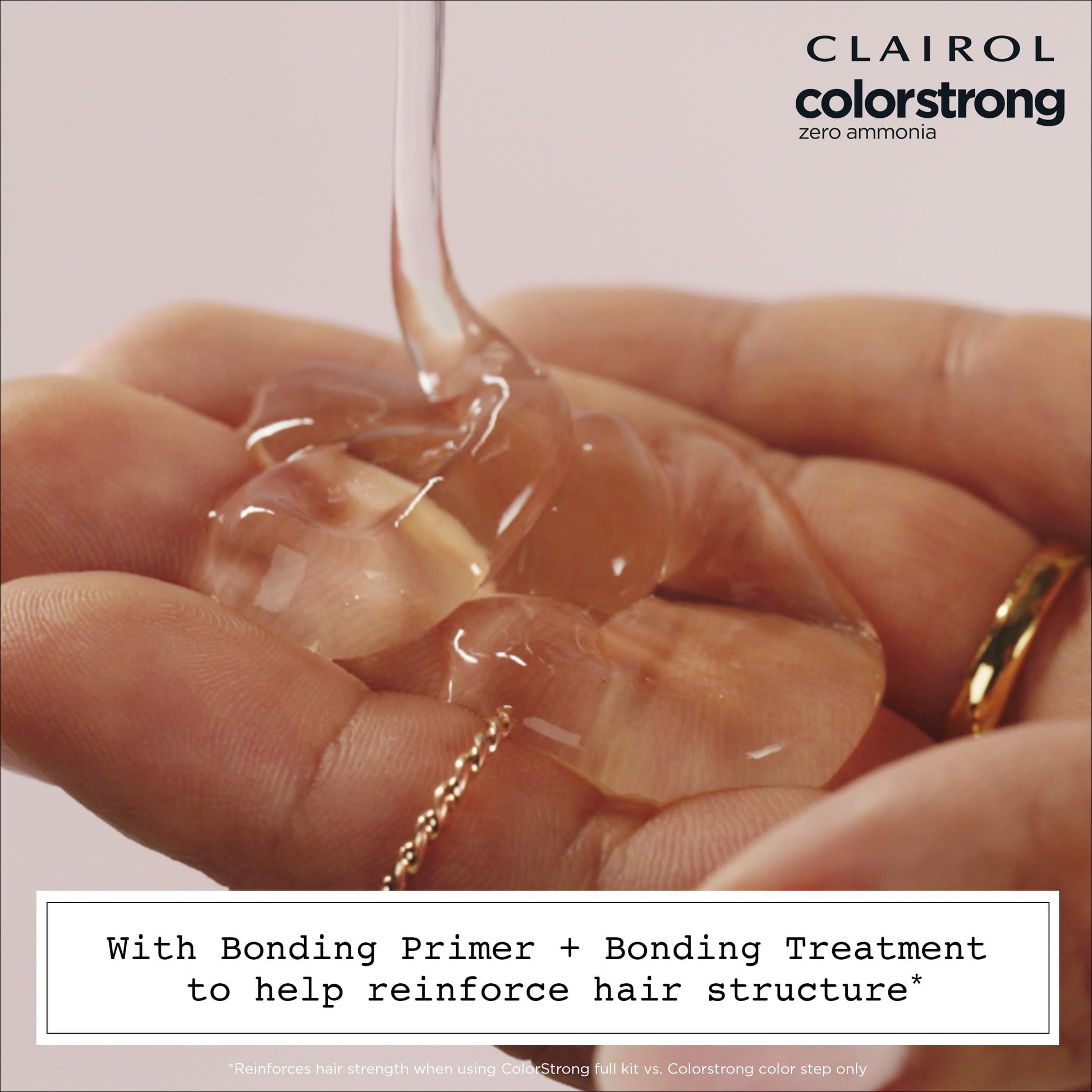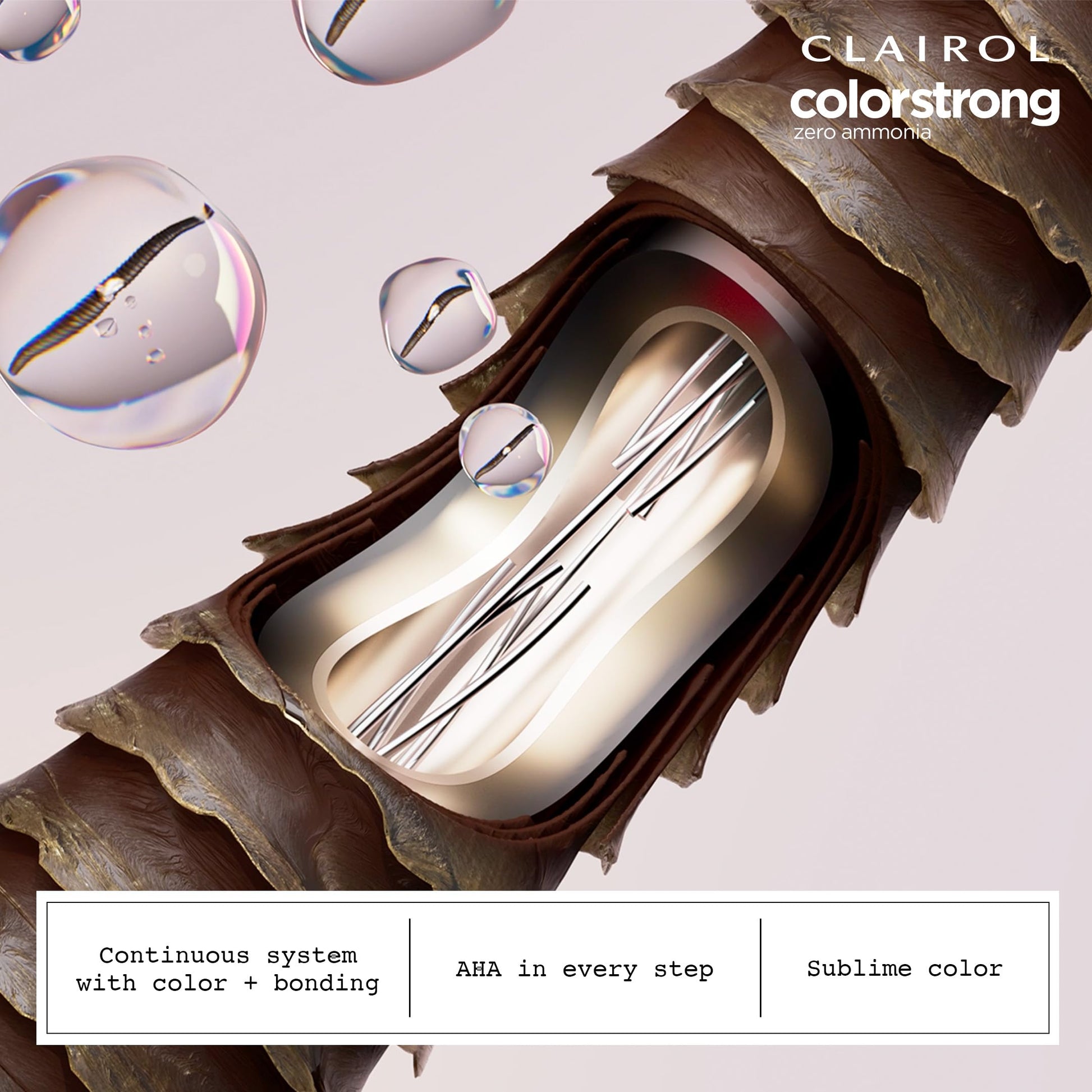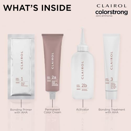 Details: TRANSPORT YOUR HAIR COLOR TO A NEW DIMENSION. Clairol ColorStrong gives you multidimensional color and reinforces the internal structure of your hair. What's the secret? The continuous system with color + bonding has AHA in every step: Bonding Primer, Permanent Color and Bonding Treatment. Zero ammonia + 100% gray coverage. Sublimely multidimensional color.