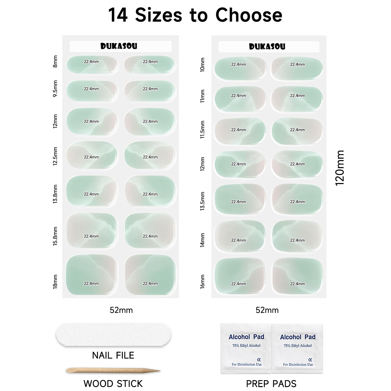 - Gel nail stickers set: DUKASOU semi cured gel nail strips package contains 28 stickers in 14 different sizes, it comes with 2 prep pads, 1 nail file, and 1 wooden stick (pressing the edge and removing), suitable for all nail sizes and shapes