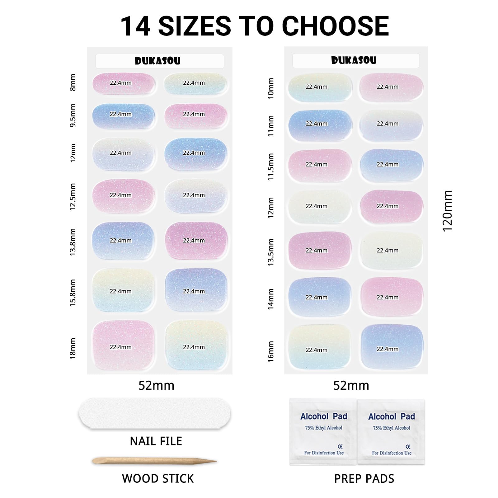 - Gel nail stickers set: DUKASOU semi cured gel nail strips package contains 28 stickers in 14 different sizes, it comes with 2 prep pads, 1 nail file, and 1 wooden stick (pressing the edge and removing), suitable for all nail sizes and shapes