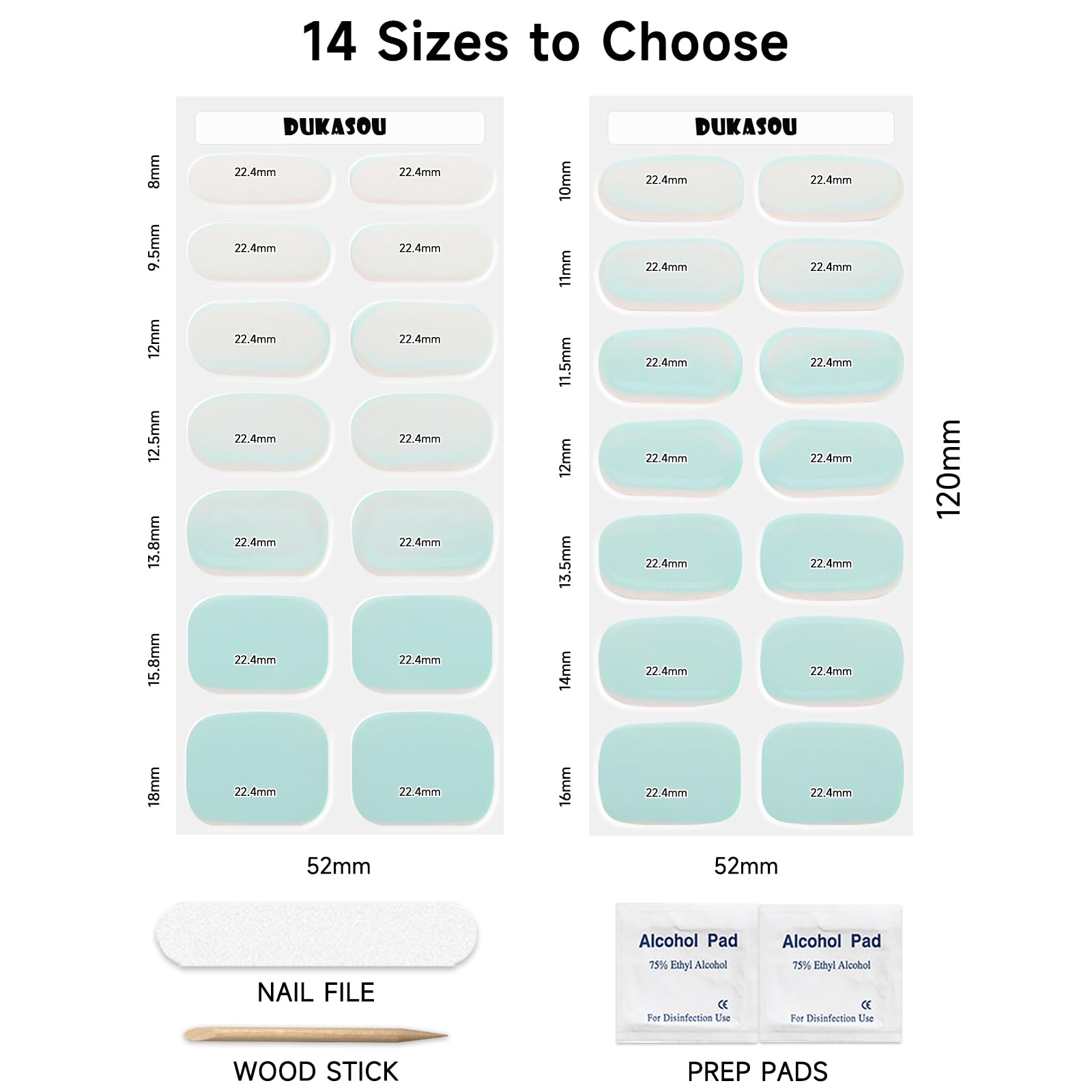 - Gel nail stickers set: DUKASOU semi cured gel nail strips package contains 28 stickers in 14 different sizes, it comes with 2 prep pads, 1 nail file, and 1 wooden stick (pressing the edge and removing), suitable for all nail sizes and shapes