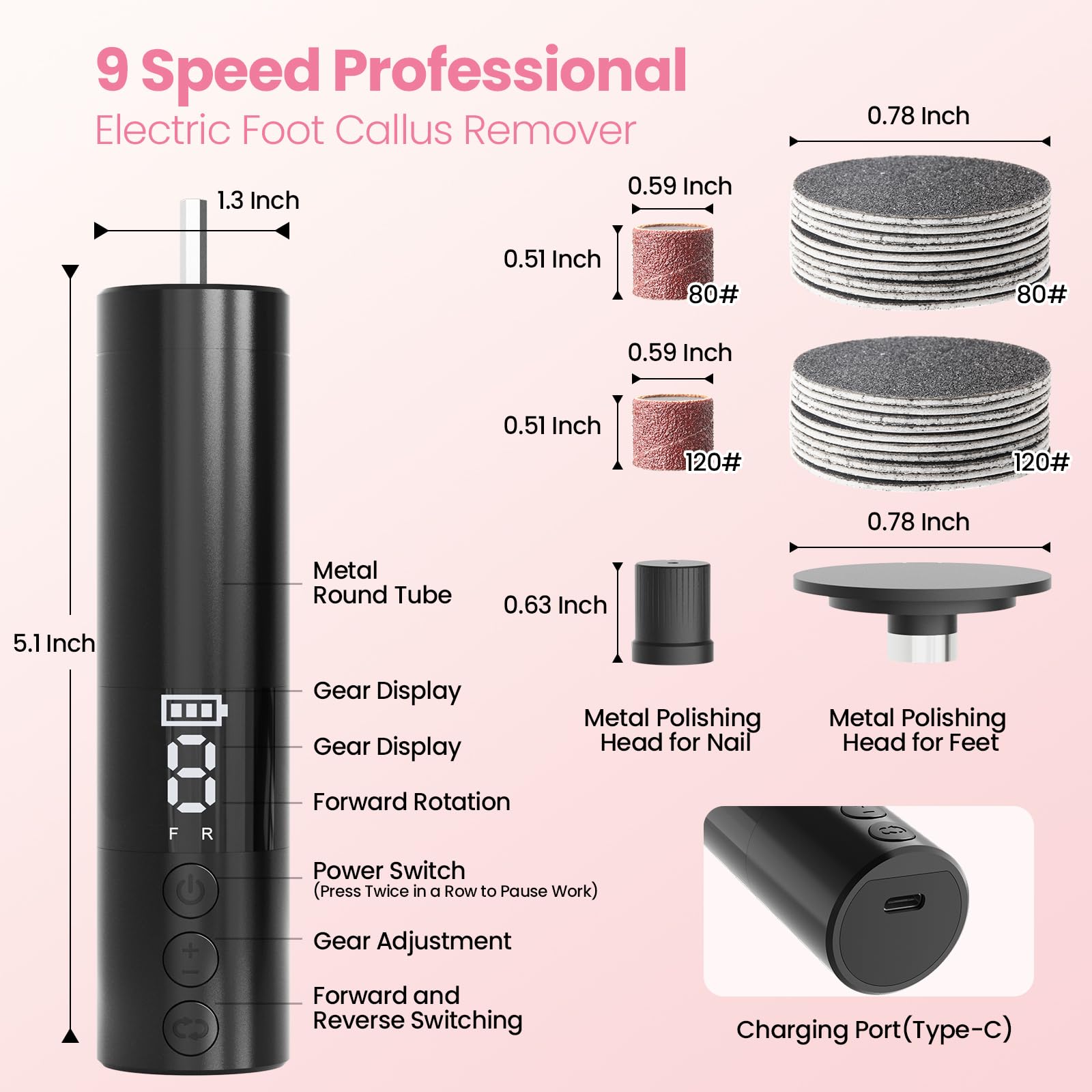 Electric Callus Remover for Feet, Rechargeable Professional Electronic Foot File Nail Grinder,9 Adjustable Speed Foot Sander Scrubber Pedicure Tool for Dry Dead Skin with Sandpaper Discs (Black)