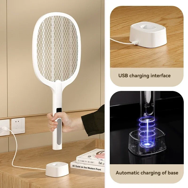 - 【2 in 1 Multi-function Flying Shooter Electric】In manual mode, continue to press the high-voltage working button to swing the electric mosquito killer manually. If you release the button, it will turn off the current mode in time. In automatic mode, the fly zapper is put into the charging base, the zapper will work automatically. The 5 LED beads will attract insects to the high voltage grid and then vibrate them.
