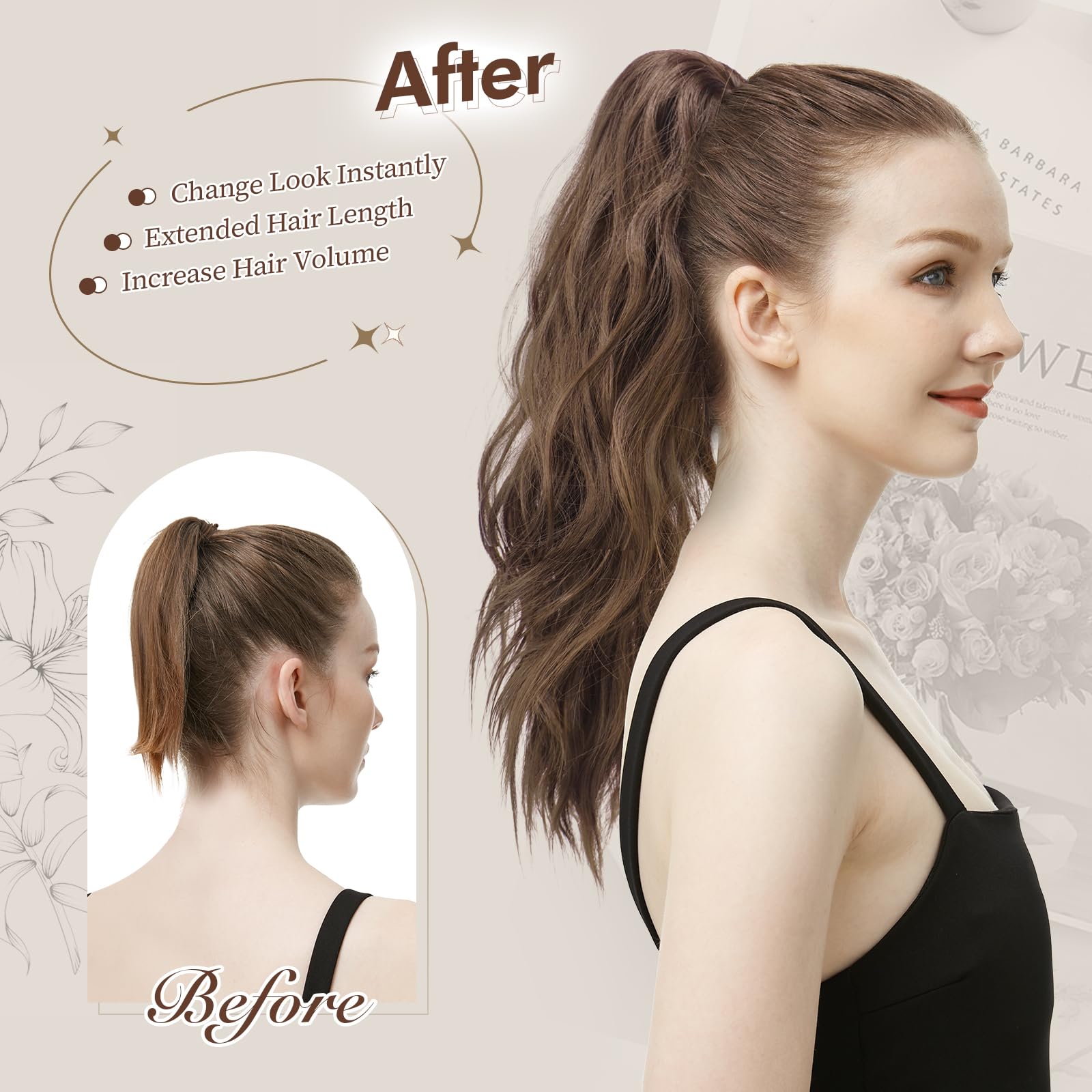 FESHFEN Ponytail Extensions, 20 inch Long Claw Clip in Ponytail Hairpiece Synthetic Pony Tails Hair Piece Natural Wavy Hairpieces for Women, Dark Brown & Caramel Blonde
